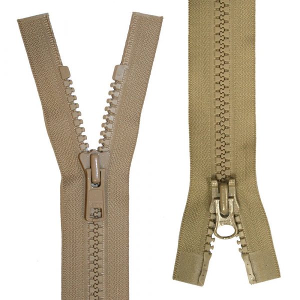 Heavy-weight moulded tooth zip with moveable bottom slider. Allows zip to be opened from both...