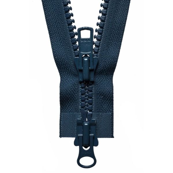 Heavy-weight moulded tooth zip with moveable bottom slider. Allows zip to be opened from both...