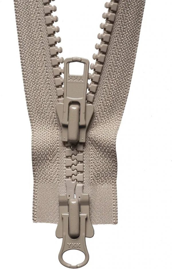 Heavy-weight moulded tooth zip with moveable bottom slider. Allows zip to be opened from both...
